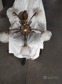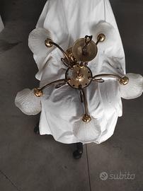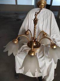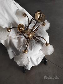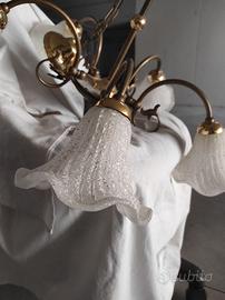 Vendo lampadari in stile liberty con braccia e attacchi in ottone in coppia o singolarmente. Punti luce inserite all'interno di 5 campanule in vetro smerigliato bianco.