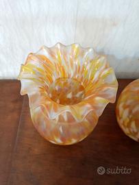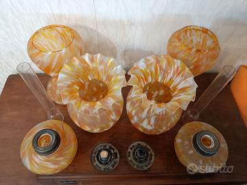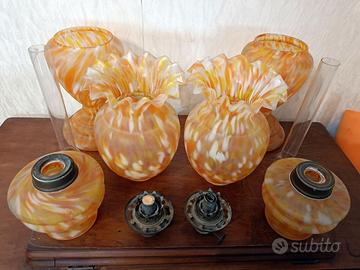 Splendida coppia di lampade a petrolio vintage, Lavorazione a Macchia Arancio e Ambra, risalenti alla metà del XX secolo, caratterizzate da una raffinata lavorazione artistica del vetro. Il set è composto da due pezzi gemelli, ideali per chi cerca un elemento d'arredo simmetrico per credenze, consolle o comodini in stile Liberty o Deco. Caratteristiche principali: Materiale: Vetro soffiato satinato (effetto opaco) con decorazione policroma a "macchia" nei toni del sole: arancione, ambra, giallo e bianco. Design: Corpo a anfora e paralume coordinato con elegante bordo superiore a "volant" (increspato). Dettagli: Bruciatori in metallo brunito originali, completi di rotella di regolazione e tubi in vetro trasparente (camini) interni. Stile: Perfette per amanti del modernariato, collezionisti di vetreria artistica o per chi desidera aggiungere un tocco di luce calda e retrò alla propria casa.