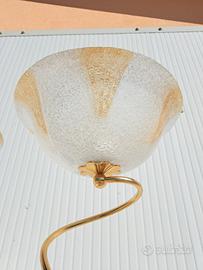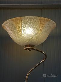 Coppia di lampade a piantana con base e stelo in metallo dorato e paralume in vetro, anni 90. Queste eleganti lampade da terra di gusto classico sono formate da una base circolare, un lungo stelo che si arriccia a spirale nella parte alta e un paralume a semisfera in vetro graniglia trasparente con decori triangolari dorati. Buone condizioni generali si evidenziano alcuni segni di utilizzo e del tempo sulle basi metalliche. Attacco portalampada E27.
