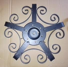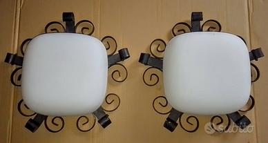 Coppia di lampade, applique o plafoniere in ferro battuto con coppe in vetro bianco satinato. Diametro cm 40, peso kg 3 (cadauna).