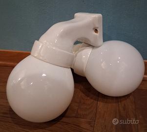 Coppia di lampade d'epoca in ceramica e vetro opalino, lunghezza 23 cm, diametro sfera 15,5 cm, sporgenza dal muro 25,5 cm. Prezzo per la coppia 90 euro. illuminazione d'epoca, vintage, industrial design