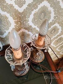 Coppia di lampade da tavolo/comodino originali d'epoca, in ottone brunito lavorato e dettagli in vetro. Un classico intramontabile per chi ama lo stile vintage o vuole dare un tocco di eleganza rétro alla camera da letto.