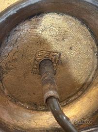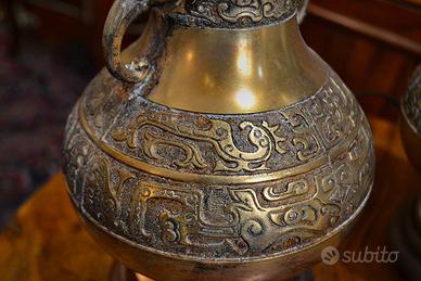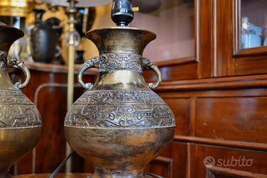 Antica coppia di vasi cinesi in ottone , in seguito convertite in lampade da tavolo risalenti ai primi del XX secolo , rifiniti da simboli arcaici e floreali, con manici a testa di elefante, poggiano su una base in legno, impianto elettrico funzionante.