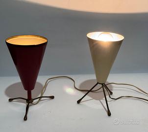 Coppia di lampade da tavolo vintage dal gusto pienamente Mid Century, struttura con base a treppiede in metallo brunito e diffusore conico in metallo smaltato.