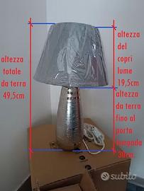 Vendesi coppia lampade da tavolo in ottime condizioni inquanto non sono mai state utilizzate, nella parte inferiore possiamo trovare la base in ceramica colorata di grigio argento mentre nella parte superiore c'è il coprilume sempre di colore grigio argento, si può installare una lampadina con attacco