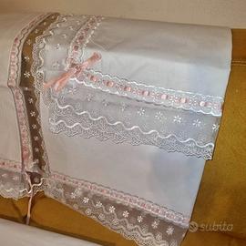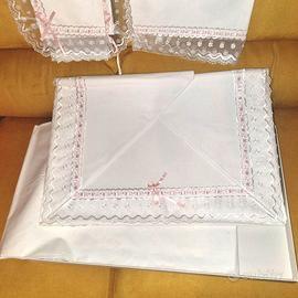 Coppia lenzuoli matrimoniali in cotone pregiato, misure 160x190cm. Federe incluse. Arricchite da pizzo e nastro rosa. Mai utilizzate, acquistate negli anni 90 e sempre conservate nella sua confezione originale.