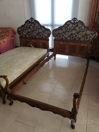 Vendo coppia letti in legno noce intagliato, completi di cassone a molle con tessuto nuovo. Larghezza testiera cm 125 altezza cm 128 lunghezza cm 210 ( per materasso da cm 100 x 195)