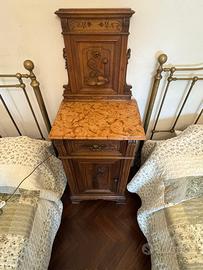 Privato vende raffinata coppia di letti singoli d'epoca in ottone pieno. I letti presentano la tipica linea Liberty con montanti tubolari e pomelli decorativi originali. Design: Testata e pediera coordinate con eleganti curvature superiori e terminali a bulbo. Materiale: Vero ottone (non ferro ottonato), con una splendida patina naturale del tempo che può essere completamente rimossa con una lucidatura con prodotti specifici per ottone. Condizioni: Eccellenti condizioni strutturali, stabili e robusti.