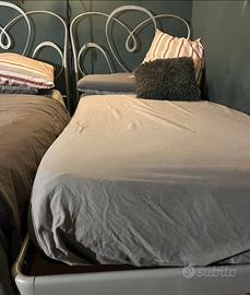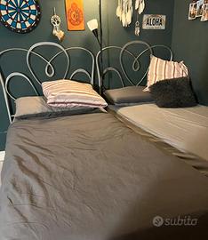 Per necessità di cambiare la camera a malincuore vendo coppia letti Bontempi in ferro con testata ferro battuto argento antichizzato praticamente come nuovi a €450,00 la coppia. Le reti a doghe che adesso ospitano sono 90x190 e vengono date con il letto, ma i letti possono ospitare tranquillamente materassi 90x200. Ritiro a carico dell' acquirente.
