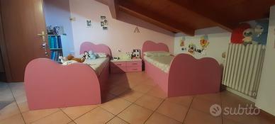Coppia letti singoli con contenitore, testata a forma di cuore,doghe in legno, in ottimo stato, con 2 comodini a 2 cassetti vendo. Materasso in memory form compreso. Solo ritiro in loco, non effettuò spedizione.