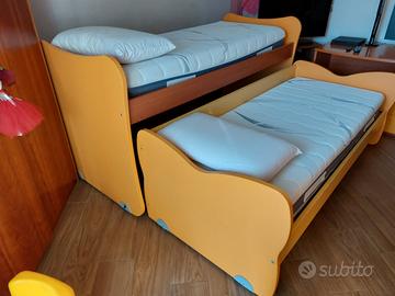 Vendo coppia di letti singoli sovrapposti e scorrevoli con ruote. Unico difetto: qualche lieve scorticatura sui bordi dei letti, come da foto, causati dell'installazione della protezione bambini, successivamente rimossa. Materassi esclusi. Già smontato. Trasporto a carico dell'acquirente.