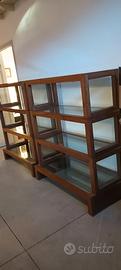 Coppia librerie/espositori italiane impilabili fine anni 90 in noce massello, vetro e profili di acciaio. Dim: 120 largh x 60 prof max ( base) x143 h 45 prof x 34 h i singoli moduli Ritiro in loco, zona Versilia.