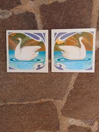 Coppia di mattonelle 15 x 15 cm interamente dipinte a mano , raffiguranti due cigni in stile liberty.