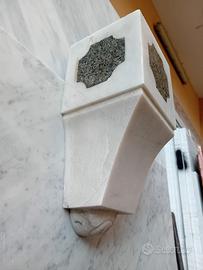 SALVE, MI CHIAMO CIRO, PROPONGO UNA COPPIA DI MENSOLE ARCHITETTONICHE IN MARMO BIANCO STATUARIO VENATO DI EPOCA CIRCA 1900/1905. CHIAMATE TECNICAMENTE "MENSOLE A SBALZO" ,CON POCHE USURE DEL TEMPO. LE MISURE DI INGOMBRO SONO CIRCA ALTEZZA CM. 34,5 X CM. 15, SPESSORE CM. 15. IN OGNI PEZZO E PER TRE FACCE SONO INSERITI DEI PEZZI DI "GRANIGLIA" CHE MISURANO CM. 9,5 X CM. 9,5.