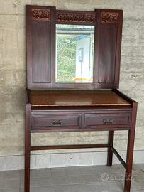 - Pettinino con specchiera mobile coordinato sempre in legno massello con piano di marmo originale, ben conservato dotato di due cassetti frontali, specchiera originale decorazioni intagliate in alto linee eleganti ideale per camera da letto, ingresso ambiente vintage, condizioni buone, vendibili anche separatamente, visionabili di persona, ritiro e carico dell’acquirente.