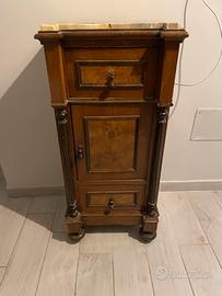 Splendida coppia di mobili d’epoca dell’Ottocento in noce massello con inserti in radica e piani in marmo originale.