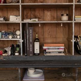 Bellissimi scaffali da laboratorio in legno, colore originale, 210 cm larghezza ciacuno, h 220 e profondità parte inferiore 50 cm, La parte superiore e quella inferiore sono separabili.