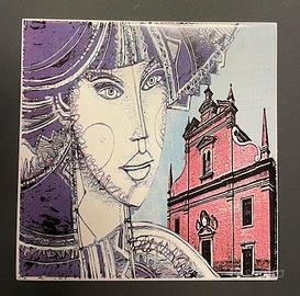 • Figura femminile stilizzata dai tratti eleganti e onirici, con cromie viola e azzurre, accostata ad architettura sacra dai toni rosati.