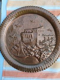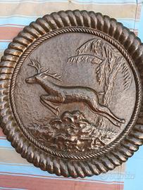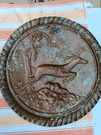 Bellissimi piatti in rame, due pezzi, con decorazioni a rilievo. Uno raffigura un castello sul mare con un veliero, l'altro un cervo che salta. Sono in buone condizioni, mostrano segni minimi del tempo. Diametro 34 cm.