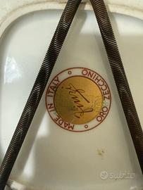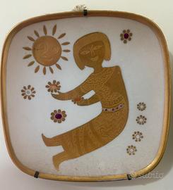 Splendida coppia di piatti decorativi da parete in pregiata ceramica bianca, realizzati in Italia negli anni '60/'70. I piatti presentano eleganti decorazioni in Vero Oro Zecchino con uno stile fiabesco e sognante che ricorda le opere di Bjørn Wiinblad. Sono impreziositi da piccoli inserti colorati a rilievo che imitano pietre dure. Dettagli dell'oggetto: • Soggetti: Una figura femminile con sole e fiori; una coppia di fanciulli con cuore e fiori. • Materiale: Ceramica smaltata con rifiniture in oro zecchino (marchio visibile sul retro). • Dimensioni: 17 x 17 cm ciascuno. • Condizioni: Ottime condizioni, doratura ben conservata e colori vividi. • Extra: Inclusi i supporti a molla (già montati) per appenderli subito alla parete. Perfetti per amanti del modernariato, collezionisti di ceramiche d'epoca o per dare un tocco "chic & gold" a un ambiente ricercato. Ritiro a mano in zona Roma est.