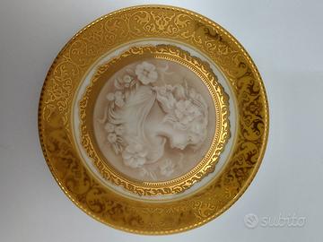 - piattino decorativo porcellana Limoges che raffigura il profilo di una donna con fiori tra i capelli, circondato da un bordo in oro lucido con motivi a volute.