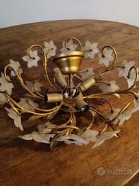 Coppia plafoniere in ferro battuto foglia oro e vetro Murano opalino. Anni 80 Diametro cm 40