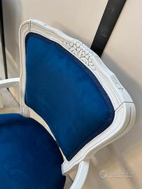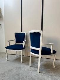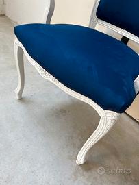 Bellissima coppia di poltroncine in legno massello, con graziosi intagli, rifinite in bianco con patina grigia e rivestite con tessuto microfibra effetto velluto, blu oltremare.