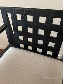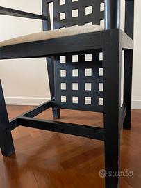 Coppia di poltroncine in rovere nero design Mackintosh produzione Movimento Moderno anni 80. assolutamente identiche alla produzione Cassina . Sono mancanti i quadratini di madreperla allo schienale .