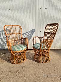 Coppia di poltroncine in bambù e rattan, produzione italiana anni 60. Sedie con forma a calice in bambù intrecciato con schienale alto e braccioli. Disponibili anche i cuscini della seduta e dello schienale con fodera a fasce bianche e verdi. Adatte per l'interno o esterno coperto come una veranda o portico, comode e leggere da spostare. Ottime condizioni generali, sempre tenute dentro casa quindi non risultano scolorite dal sole.
