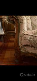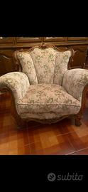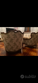 Vendo elegante coppia di poltrone risalenti probabilmente alla fine dell’800, fatte ritappezzare. Struttura solida in legno massello con raffinati intagli e linee classiche. Seduta ampia e confortevole con rivestimento in tessuto floreale. Ideali per: soggiorno elegante studio o taverna casa di campagna o arredamento vintage Condizioni ottime. Vendute in coppia, ritiro a mano.