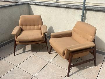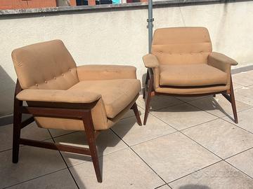 Coppia poltrone vintage anni 70 stile svedese in legno tinto noce e rivestimento come da foto, molto solide e comode