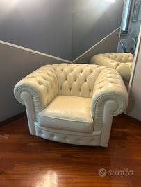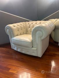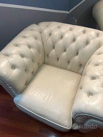 Vendo splendida coppia di poltrone modello "Chester", realizzate artigianalmente in vera pelle di alta qualità color bianco panna. Le poltrone sono una fedele replica del celebre modello Chester di Poltrona Frau, caratterizzate dalla classica ed elegante lavorazione capitonné eseguita interamente a mano su schienale e braccioli. Dettagli principali: Materiale: Vera pelle pieno fiore, morbida al tatto e resistente. Colore: Bianco Panna(facilmente inseribile in contesti moderni o classici). Stato: Ottime condizioni, pelle ben conservata, presentano alcuni segni di utilizzo, sedute solide e confortevoli. Design senza tempo e pedini in legno scuro. Perfette per arredare un salotto di prestigio, uno studio professionale o una zona relax.