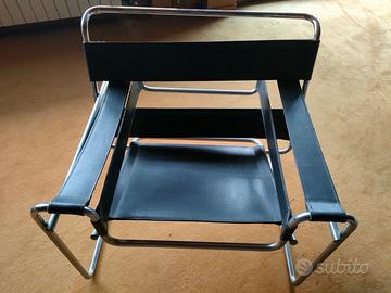 Coppia di poltrone di design modernariato in buono stato, non originali. Struttura in metallo e seduta nera. Tubolari da rilucidare. Ottimo per arredamento vintage.