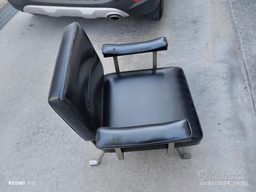 poltrone anni ’70 con struttura in acciaio e imbottiture rivestite in pelle nera, dal design razionalista/industriale, tipico di ambienti ufficio, sale d’attesa o arredo contract dell’epoca.