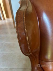 Vendo splendida coppia di poltrone in vera pelle color cuoio, dallo stile classico ed elegante, ideali per salotto, studio o taverna. Le poltrone presentano una struttura solida con raffinati dettagli in legno intagliato sui braccioli e sui piedini, che donano un tocco vintage e ricercato. La seduta è ampia e molto comoda. Condizioni: In ottimo stato generale. La pelle è ben conservata, morbida e senza danni strutturali, solo un piccolo graffio superficiale e leggeri segni di usura su una cucitura e sulle pieghe di una delle due poltrone dovuti al normale utilizzo (visibili in foto). Caratteristiche: Vera pelle di qualità Colore: cuoio / marrone caldo Struttura robusta in legno Stile classico/vintage Vendute in coppia Ritiro: Solo ritiro a mano a Nerviano (MI). Disponibili entro maggio, necessario organizzarsi per il ritiro possibilmente entro fine aprile. Note: Prezzo leggermente trattabile per vendita veloce. Ottima occasione per chi cerca arredo elegante a un prezzo conveniente! Contattami per ulteriori informazioni o per venire a vederle.