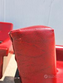 Coppia poltrone imbottite rivestite in similpelle rossa e gambe in metallo. Due comode poltroncine da salotto con braccioli, imbottite in espanso e con struttura in ferro. Rivestimento in similpelle rosso vivo arricchito da venature bordeaux, buone condizioni generali con leggeri graffi evidenziati in foto. Databili negli anni 70 per l'uso di materiali e la loro forma squadrata.