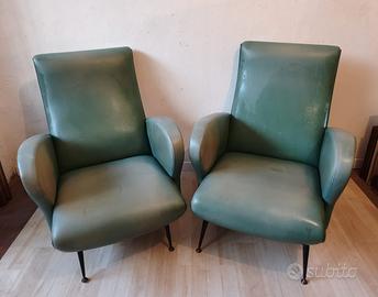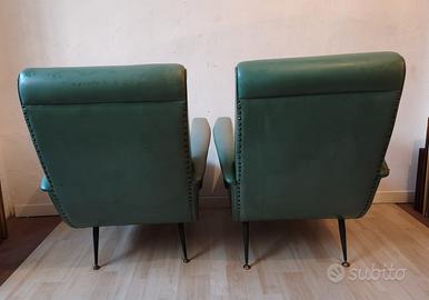 Coppia di poltrone in similpelle anni 60 stile Lady di Zanuso con gambe metalliche e puntali in ottone. Presentano segni d uso. Misure L. 65 P. 85 H. 83 Solo ritiro in Cuneo
