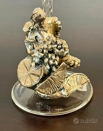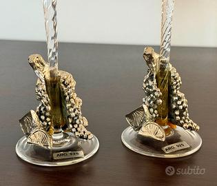 Splendida coppia di portacandele vintage in cristallo (o vetro soffiato di alta qualità), caratterizzati da decorazioni alla base finemente lavorata a mano con motivo di vite e uva, simbolo di abbondanza. Corpo in cristallo trasparente con applicazioni tridimensionali placcate con etichetta "Argento 925". Il Set è composto da due pezzi di altezze diverse (H. 23 cm e H. 24 cm), ideali per creare un gioco di volumi elegante su una tavola o un camino identici nelle restanti misure e con diam superiore di 6cm. e foro portacandele di circa 2 cm. Ottime condizioni generali, senza sbeccature nel vetro. Come visibile dalle foto di dettaglio, la resina di fissaggio originale ha assunto una colorazione ambrata, tipica dei pezzi vintage autentici di questo periodo, che non pregiudica la stabilità dell'oggetto e ne attesta l'autenticità e l'epoca. Un set raffinato, perfetto per amanti dell'oggettistica classica italiana e del decor d'interni vintage. Ritiro a mano provincie Monza Brianza, Milano, Bergamo.