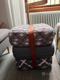 Divisibili ognuno in 3 singoli cuscini grazie a cintura di pelle rimovibile.