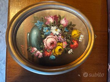Coppia di quadri ovali vintage raffiguranti nature morte floreali, pittura decorativa firmata “Minini” (firma visibile in foto).