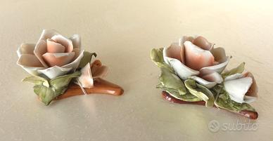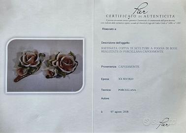 Raffinata coppia di rose in porcellana Capodimonte, epoca XX secolo, complete di certificato di autenticità Pier (Brescia).