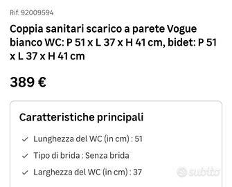 Vendo coppia di sanitari (wc e bidet) filomuro acquistati ma mai montati poiché incompatibili col mio impianto. I sanitari sono nuovi e completi di tutti gli accessori presenti in fase di acquisto (tavoletta, etc..)