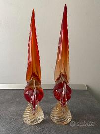 Coppia di due fantastiche sculture da collezione in vetro di Murano sommerso, con sfumature rosso/arancio, vintage anni '50, rappresentanti le figure di due volatili (galli o fagiani) con base, cresta e becco cosparsi di aventurina d'oro. Made in Italy, probabilmente riconducibili a vetreria Avem Murano. Dimensioni: altezza circa 44 cm, larghezza circa 31 cm. Il prezzo è per la coppia, in caso di vendita separata la richiesta è 250 euro l'uno. Ottime condizioni, ritiro a Diano Marina, NON si effettua spedizione.