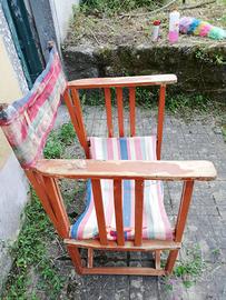 complementi d'arredo da giardino. Sdraio stoffa, giallo, verde, rosso e blu, La stoffa presenta una rottura a bordo seduta. Dimensioni: H. 79 X L. 140 X P. 56. L'altra sedia, cosiddetta da regista, ha la stoffa da sostituire ed i braccioli da riverniciare un po', le strutture sono buone. Gli oggetti si trovano in un appartamento a Pistoia. Visionabile personalmente. Ritiro a cura dell'interessato.