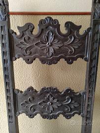 Realizzate in legno nero in stile barocco, Presentano intagli decorativi molto elaborati sia sullo schienale alto che sul pannello frontale sotto il sedile. Hanno una seduta quadrata e gambe dritte e robuste. € 300 coppia. Singola € 160