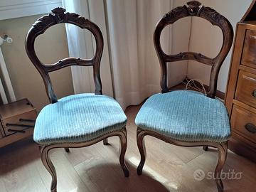 Vendo coppia di sedie d'epoca (€ 150 la coppia), nr 3 poltrone stile inglese con pouf (€ 300 il set), vetrina grande (€ 150). Anche separatamente. Non spedisco. Contattare per ulteriori foto e/o dettagli. Offro massima serietà.