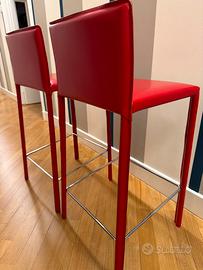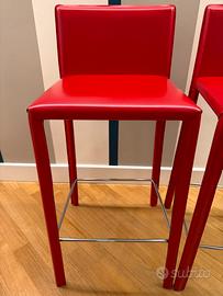 Coppia sgabelli bar in acciaio e pelle colore rosso “Ferrari”. Altezza seduta 75 cm, altezza totale 87 cm, larghezza 38 cm, profondità 37cm. Ottime condizioni. Solo un segno sullo schienale di uno sgabello come evidenziato in foto.