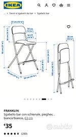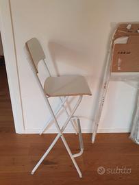Sgabelli Franklin IKEA colore bianco. Uno sgabello usato, arrivato leggermente scheggiato e uno sgabello nuovo ancora nella confezione. Puoi chiudere le sedie quando non le usi, così occupano meno spazio. È confortevole, grazie al poggiapiedi. I piedini in plastica donano stabilità alla sedia e riducono il rischio che si formino segni sul pavimento. Il blocco di sicurezza integrato evita che la sedia si chiuda accidentalmente quando la sposti. Prezzo indicato è per entrambi gli sgabelli.
