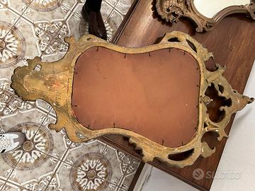 Coppia di specchiere in legno dorato con ricca cimasa a giorno scolpita con volute e rocailles. XX sec Mis: altezza 88cm - larghezza 48 cm Specchiere vintage Da ritirare in loco
