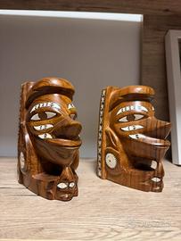 Simpatica coppia di statuette realizzate a mano nelle Isole Salomone. Intarsi in madre perla. Altezza 15 cm, profondità 13 cm.